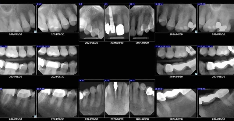 Digital dental X-rays allow your dentist to see areas that are not visible during a regular exam. Depending on your needs, different types of X-rays may be used. Bitewing X-rays help detect cavities between teeth, while periapical X-rays show the entire tooth, including the root and surrounding bone. A full-mouth series (FMX) is often recommended for new patients to provide a complete overview of oral health. Panoramic X-rays capture the entire jaw, sinuses, and bone structure in a single image, and in more complex cases, a CBCT scan may be used to create detailed 3D images for implant planning or advanced treatment.